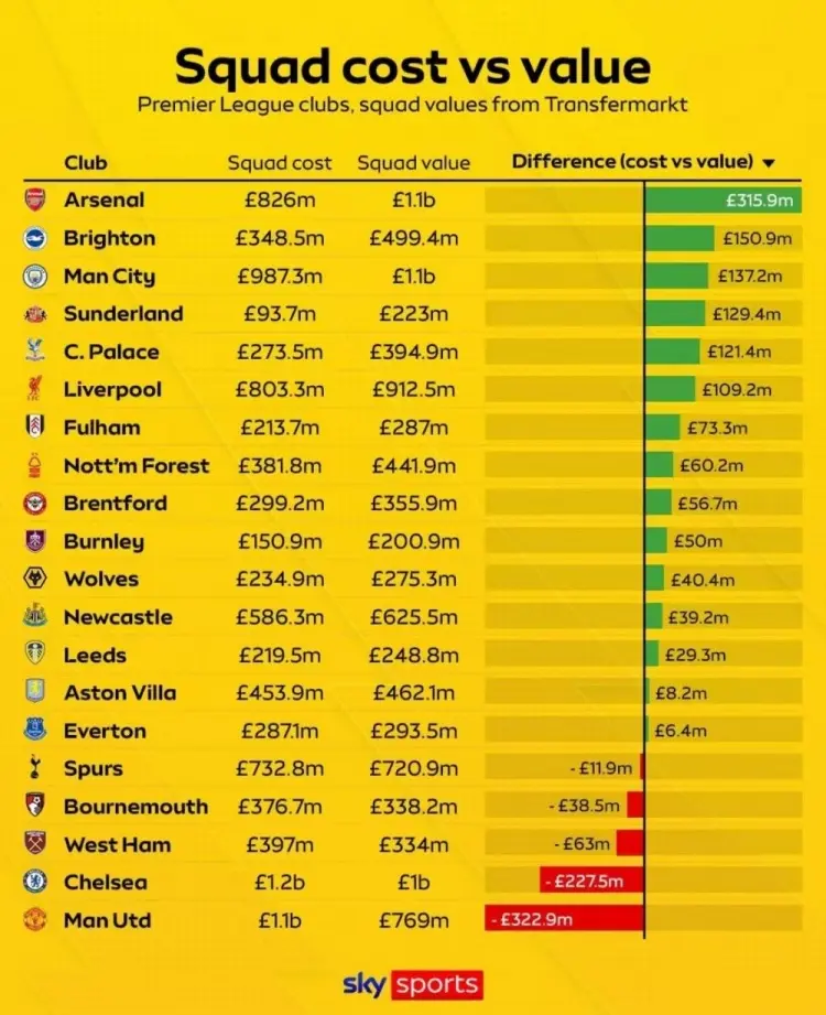 阿森纳是英超阵容性价比(球员升值幅度)最高的球队,阿尔特塔仅凭这一点就足以说服管理层为他追加投资。