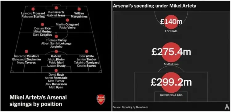 在具体的人员选择方面,阿尔特塔刻意避开了与其他Big6球队之间的军备竞赛,他选择的后场球员大多是具备成长潜力的新人(如萨利巴和加布里埃尔),锋线援兵则为豪门弃将(热苏斯和哈弗茨)。得益于球队战绩的提升,以及年轻球员的成长,阿森纳的阵容增值达到了3.159亿英镑,成为英超阵容性价比最高的球队。