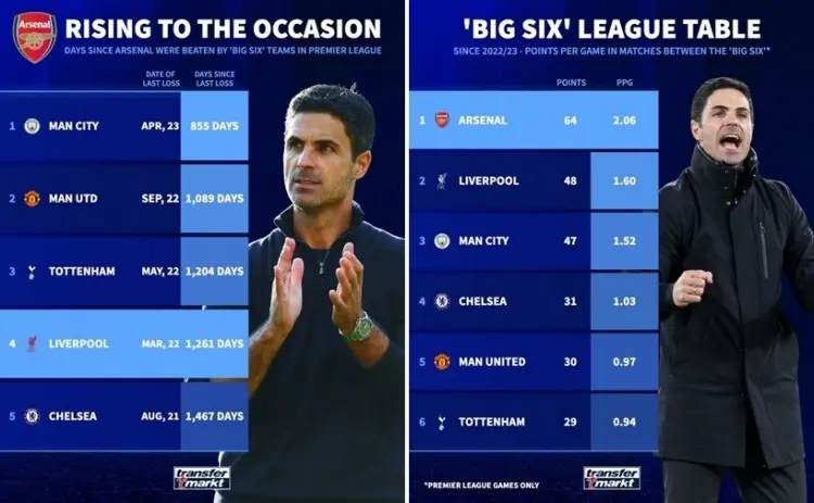 昔日的溃败之师,成为了如今的Big6小联赛不败之师,阿尔特塔完全改变了阿森纳的气质。