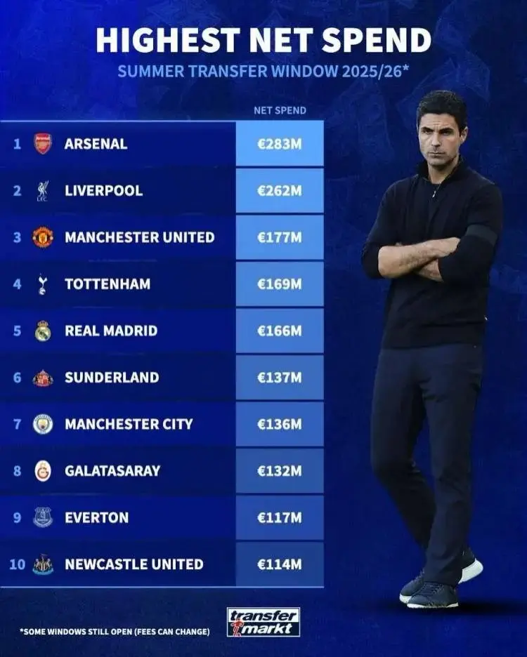喧嚣无比的2025夏窗已经结束,利物浦完成了高达4.83亿欧元的史诗级豪购,切尔西是阵容变动幅度最大的球队,另一支英超争冠球队阿森纳则成为了净投入最多的球队。在执教枪手的第七个赛季,阿尔特塔获得前所未有的支持,也来到了退无可退的绝境。